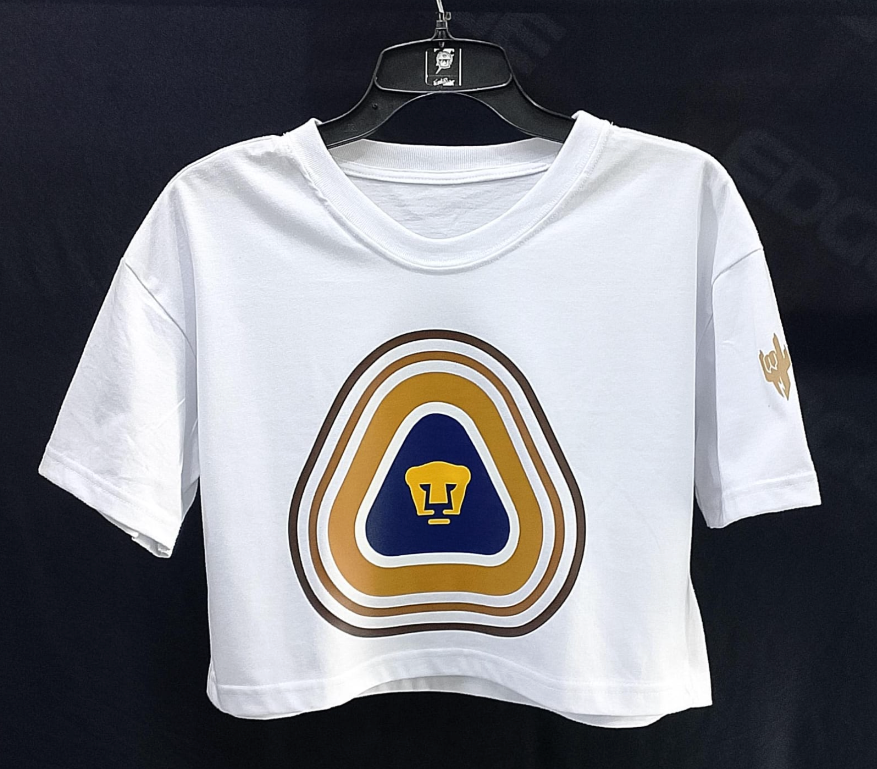 Playera crop para dama con diseño inspirado en el icónico triángulo conmemorativo del 50 aniversario de Pumas. Confeccionada en tela cómoda y ligera, ideal para uso diario o para mostrar tu pasión por el equipo con un estilo moderno. Su corte corto le da un toque actual y casual, perfecto para combinar con jeans, shorts o outfits deportivos.